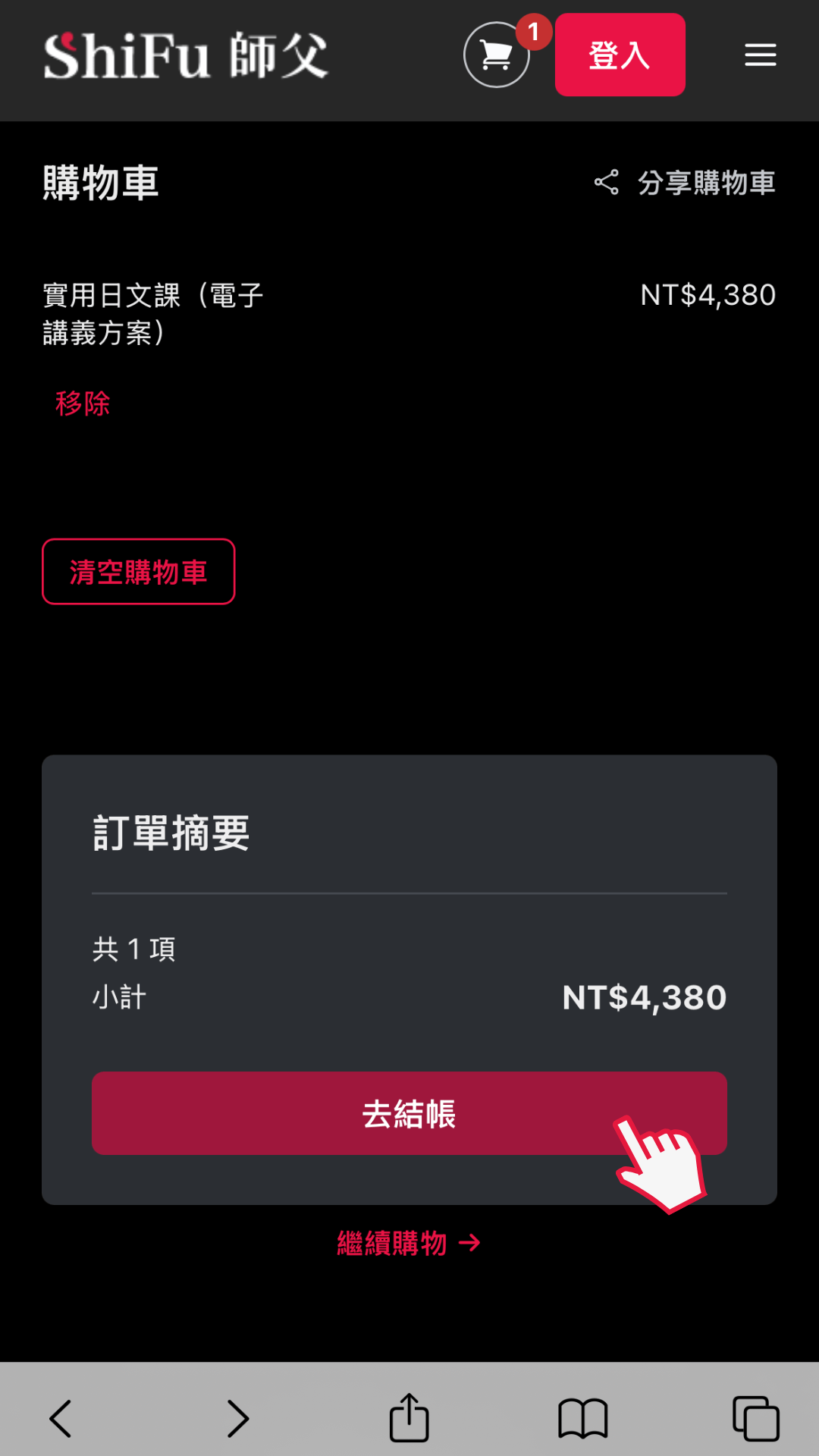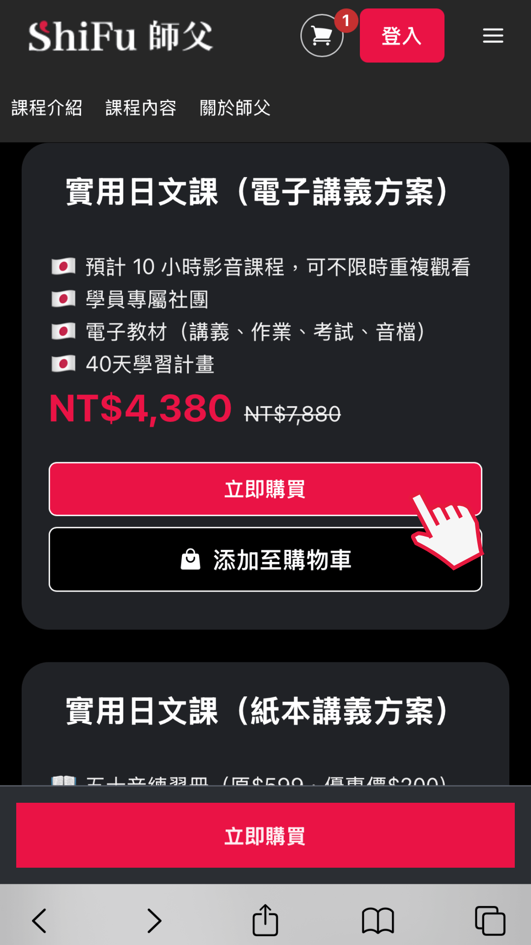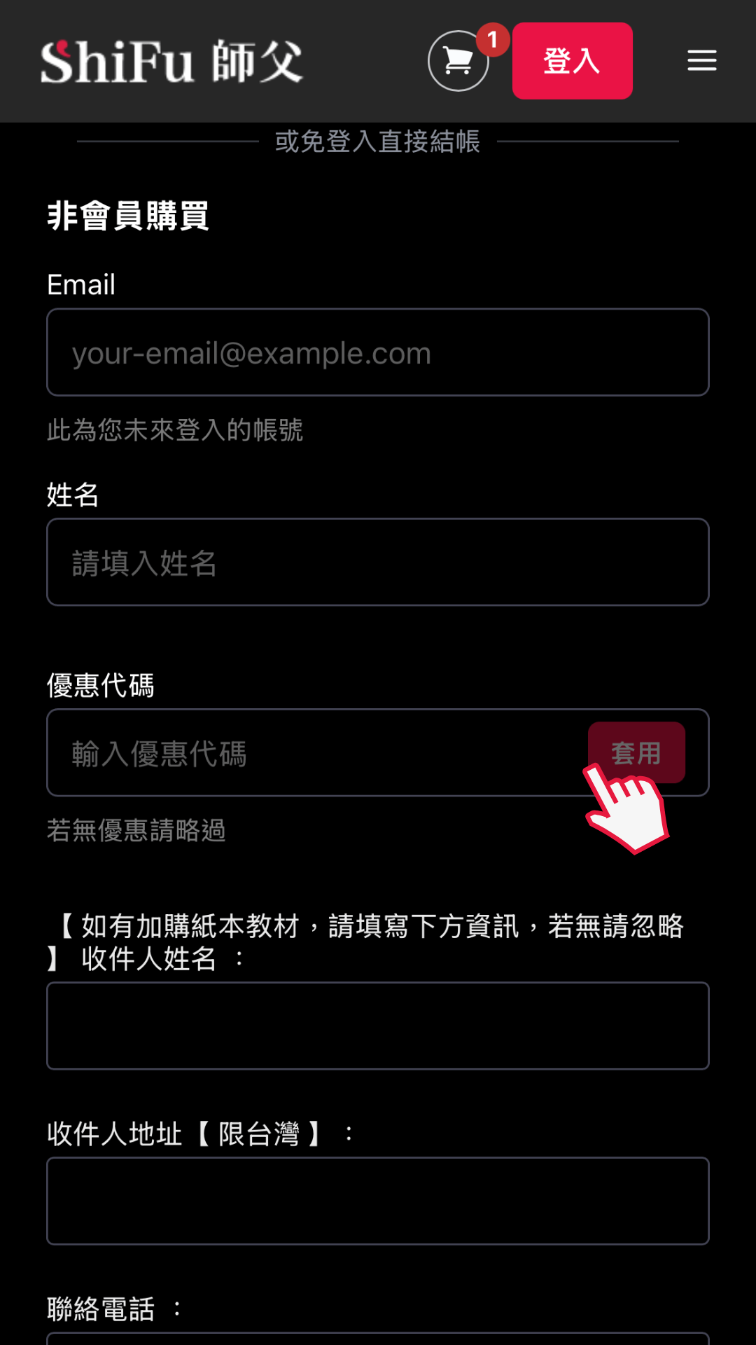 Step 5:網頁將會跳轉至結帳頁面,如已有會員請選擇「登入/註冊」,如果沒有申請過請選擇「非會員購買」;填入購買人Email、真實姓名、優惠代碼等資訊後,點擊「立即購買」。