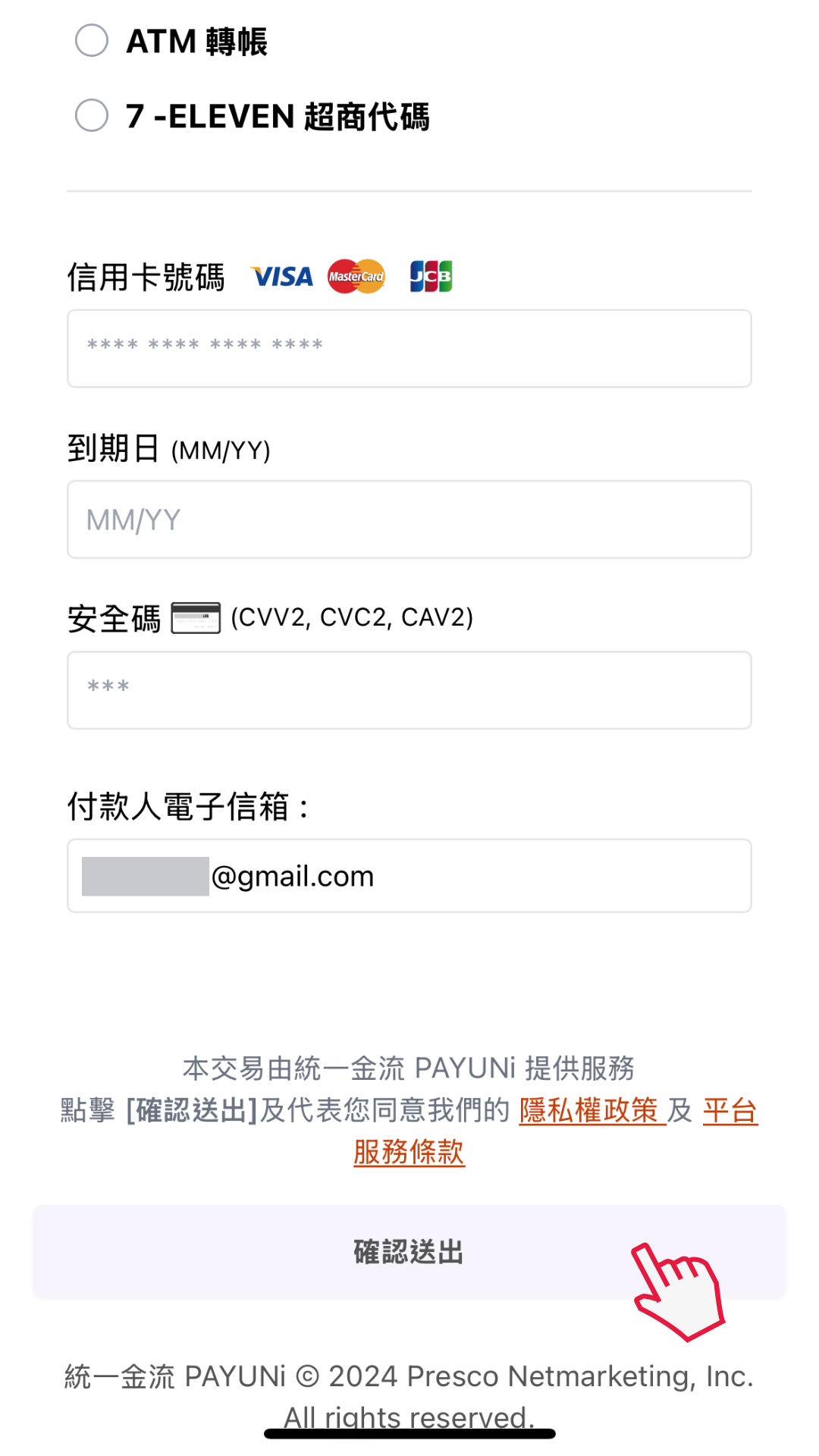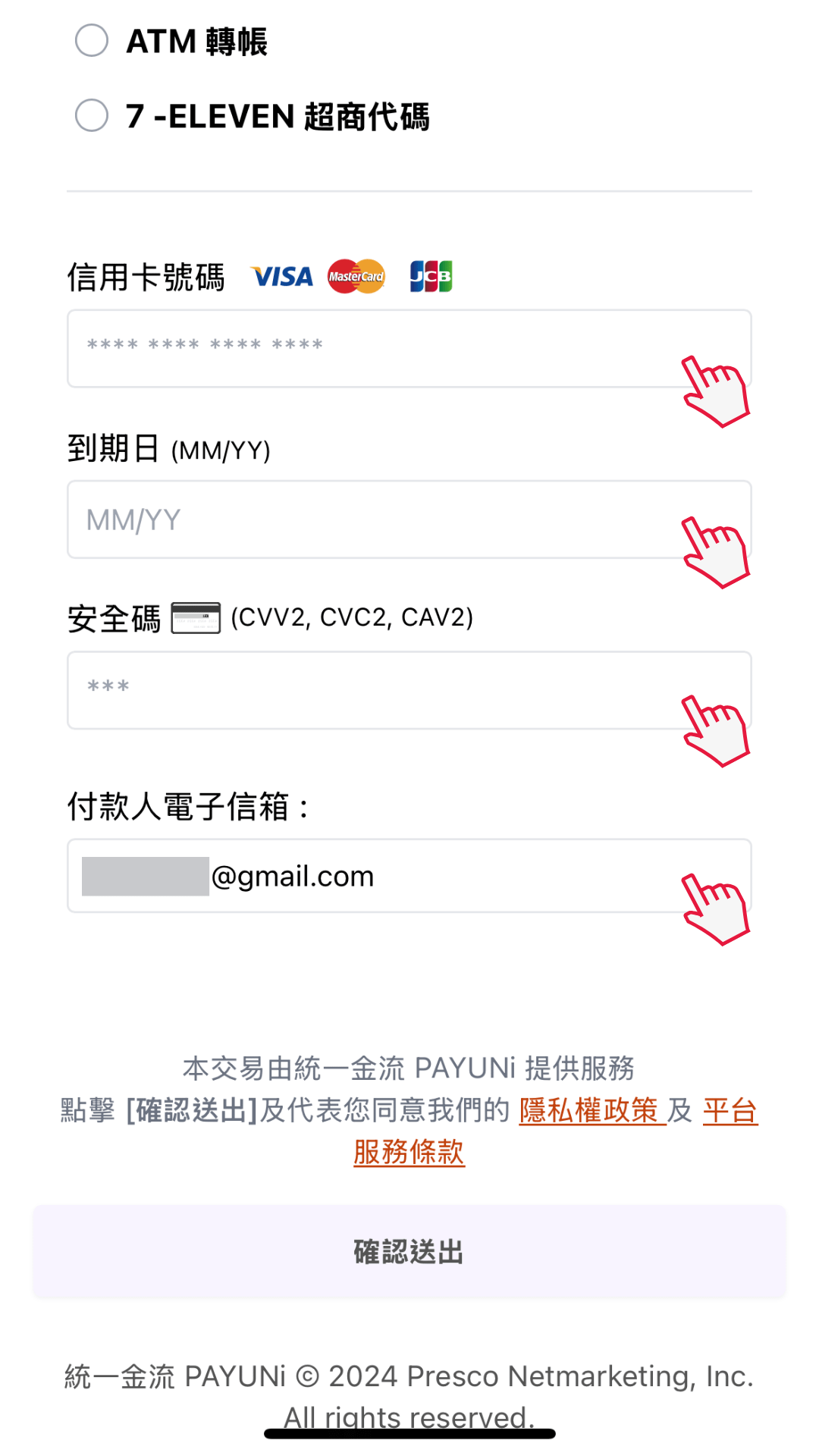 Step 6:畫面將會跳轉至統一金流第三方金流平台,選擇想要使用的付款方式,填入相關資訊後,點擊「確認送出」。