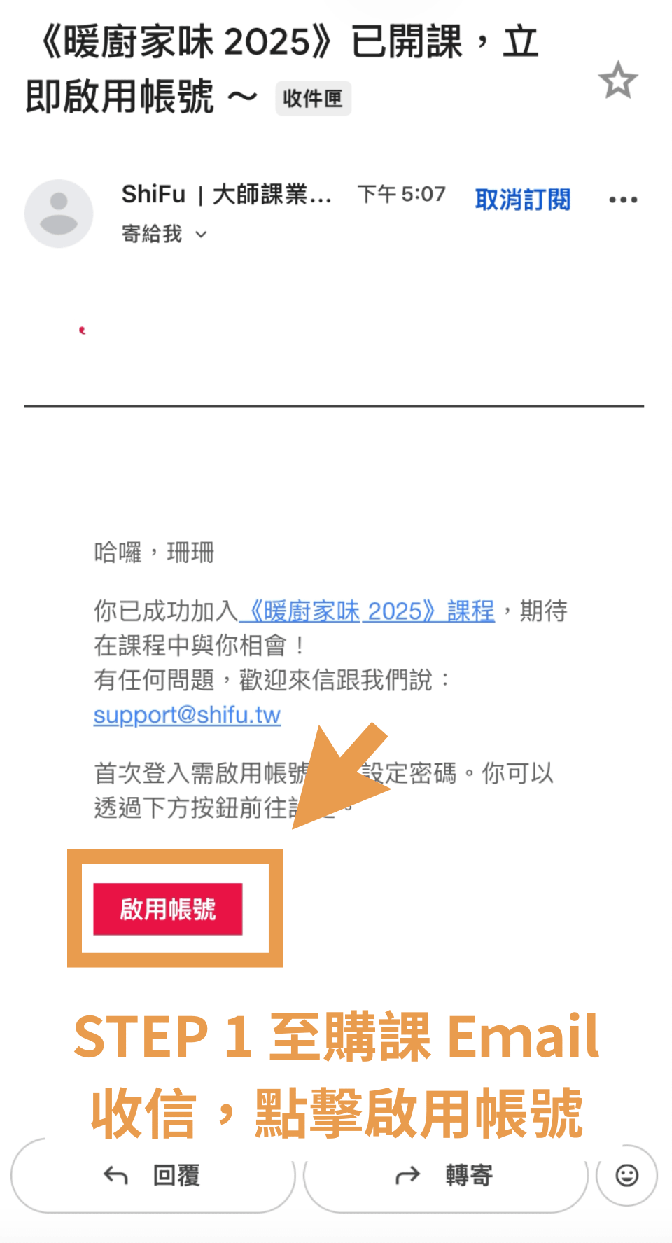 請您到 Email搜尋「暖廚家味 2025 已開課,立即啟用帳號 」信用標題,